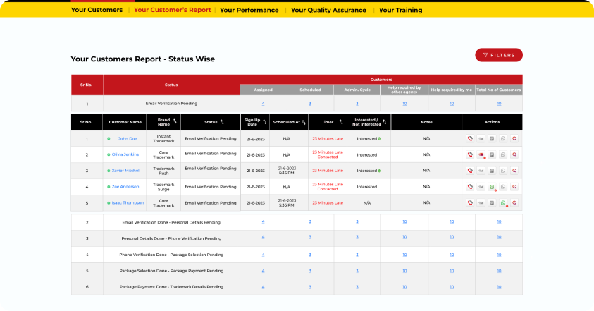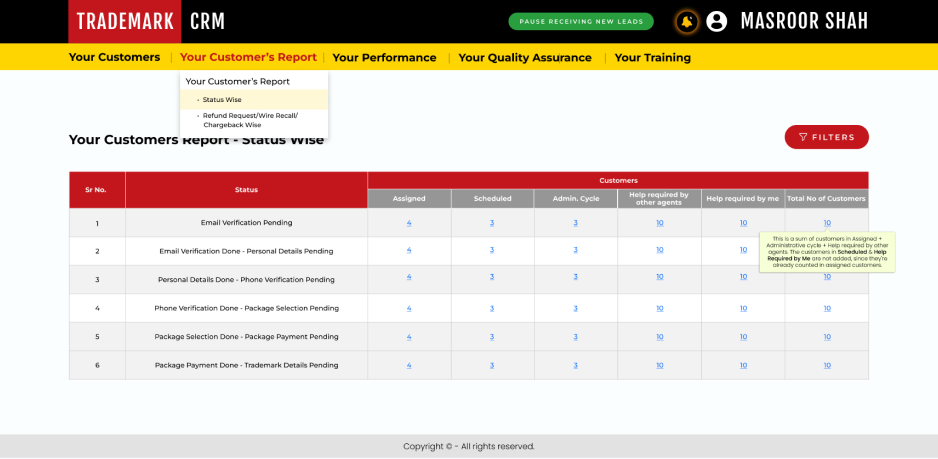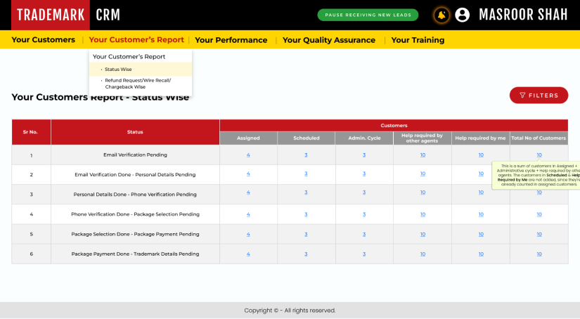 By clicking on the number of customers in any column, you will get a detailed view of each customer on that particular status.