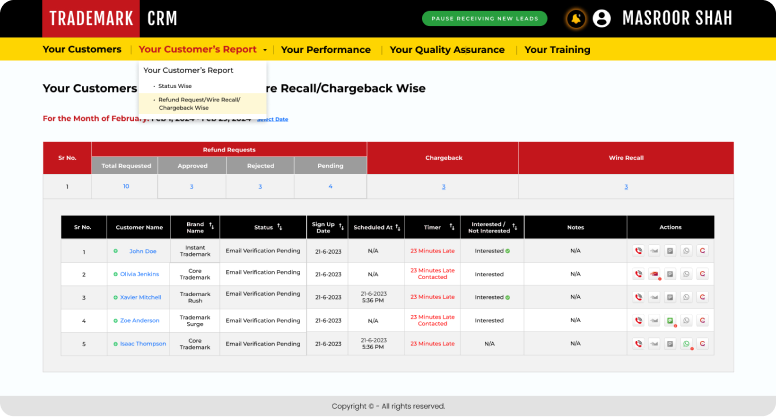 Refund, Wire Recall & Chargeback Wise Customers Report