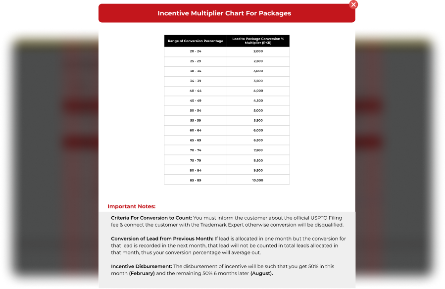- Lead to Package Conversion % Multiplier (PKR): Specifies the multiplier in PKR applied to the base incentive, increasing with higher conversion rates.