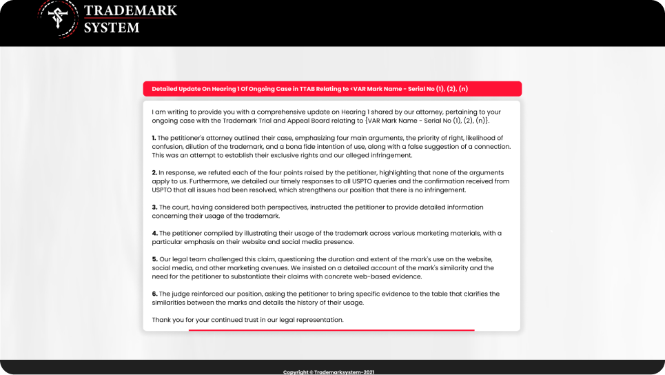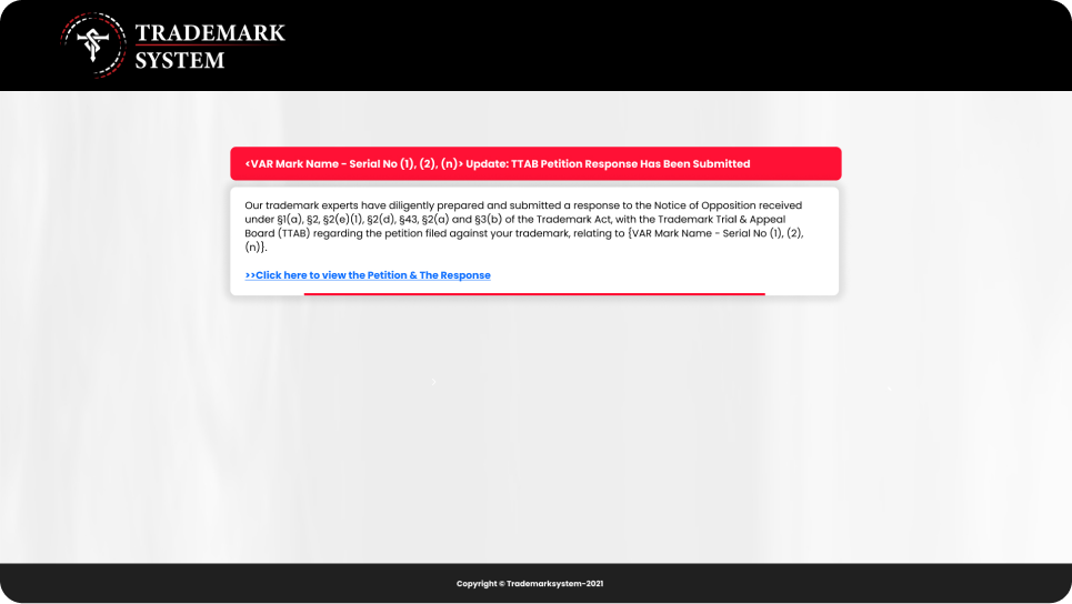 - Response to TTAB Petition filed against your trademark in the USPTO Trademark Trial & Appeal Board.