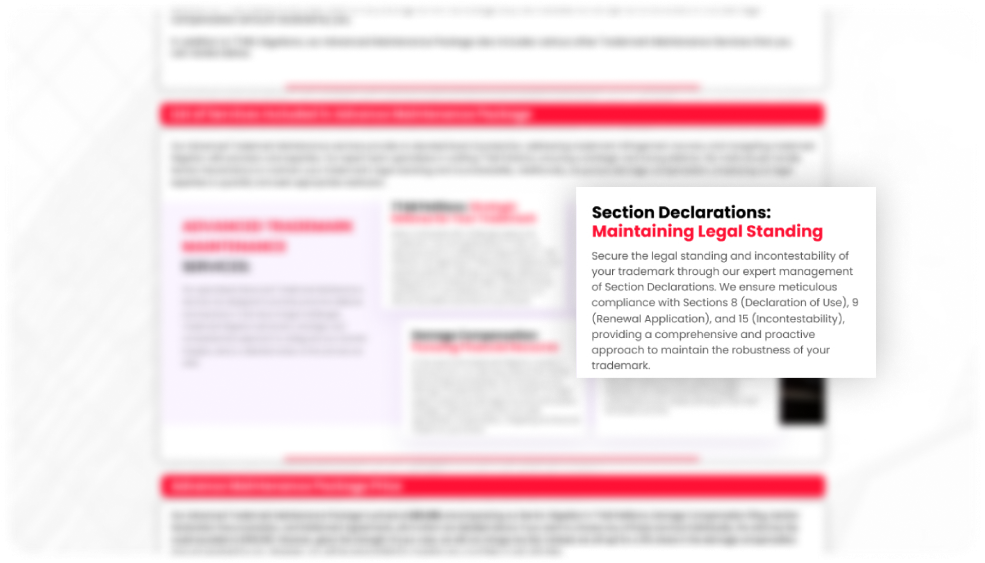 - Section Declarations Filing to secure the legal standing and incontestability of your trademark.