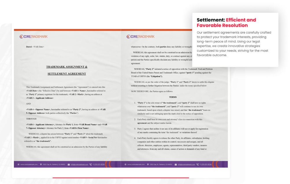 - Settlement Agreements for efficient and favorable resolution of trademark disputes.