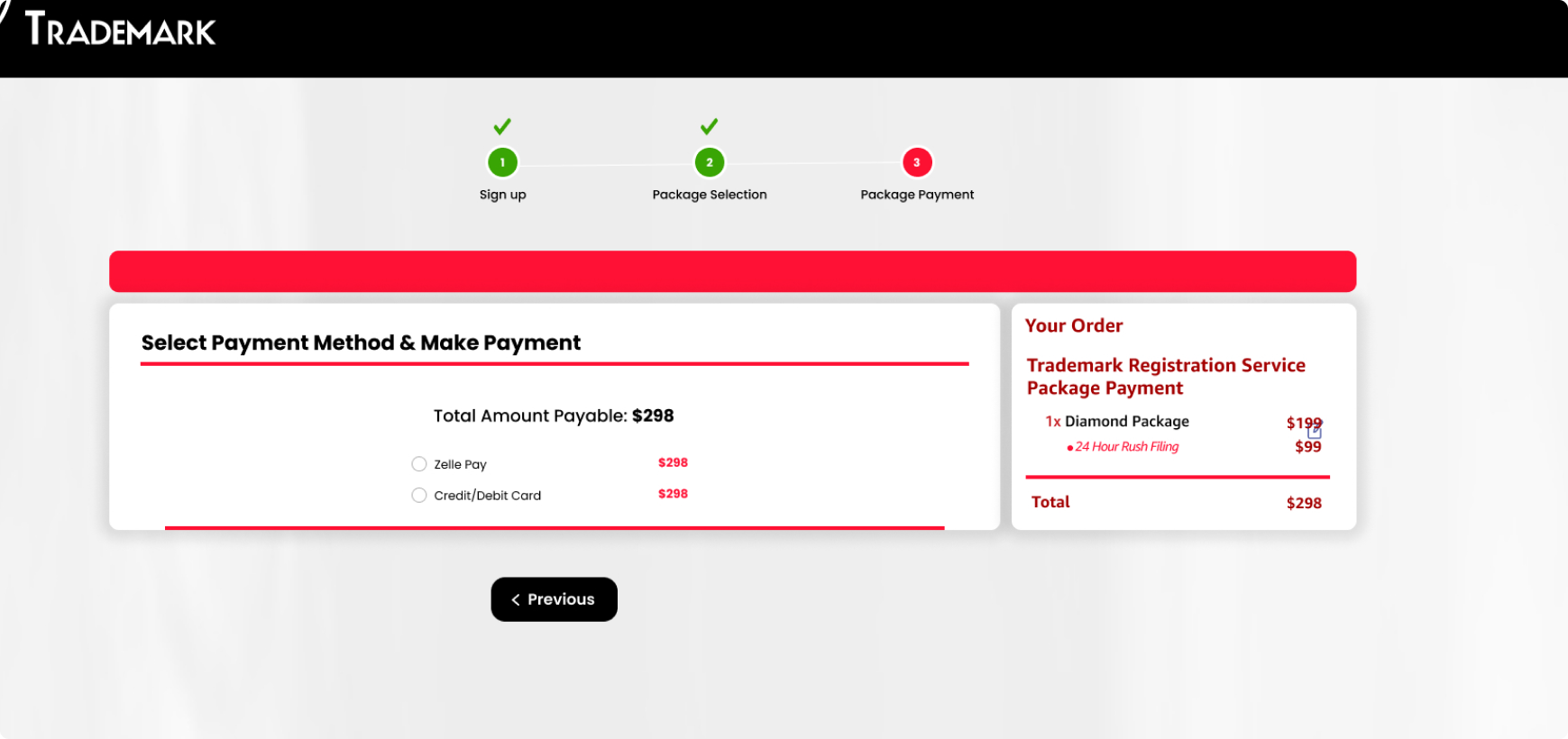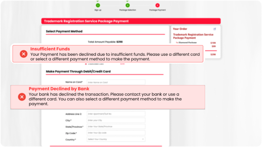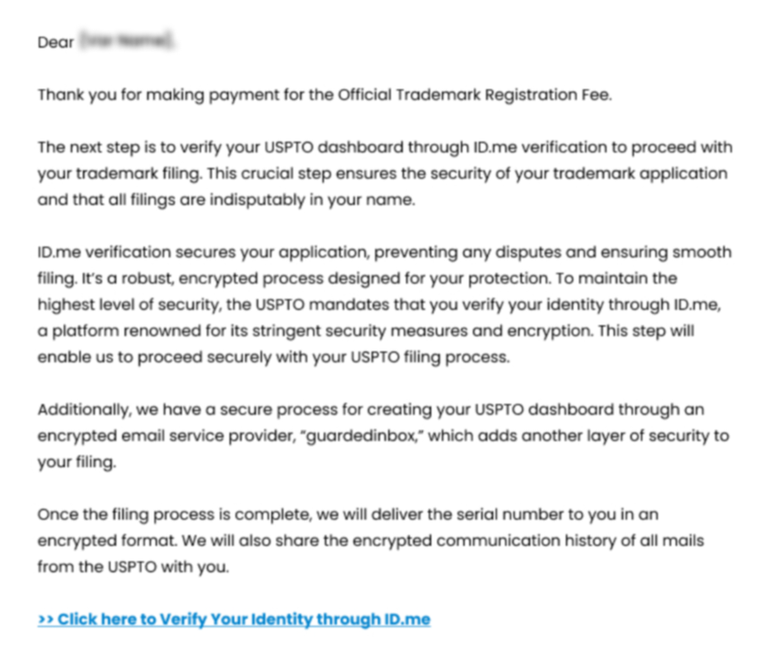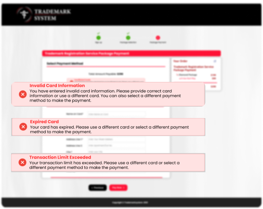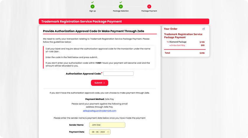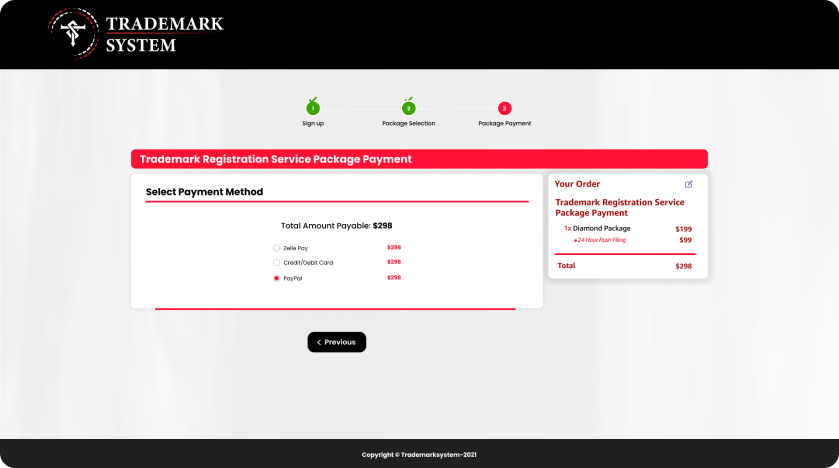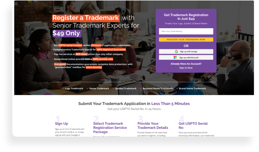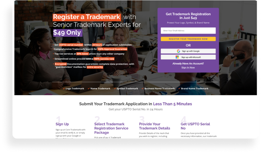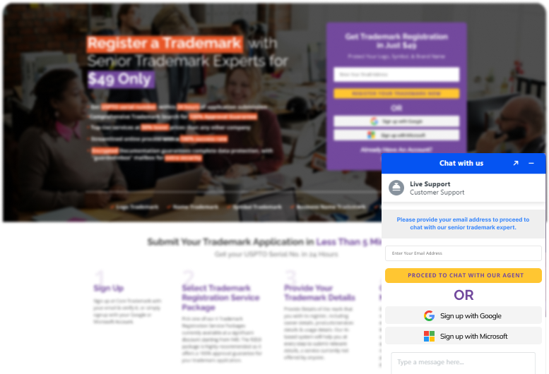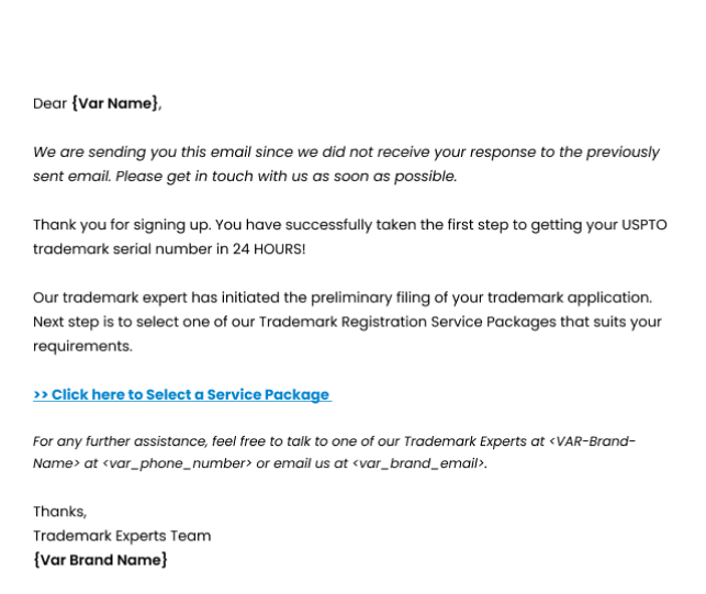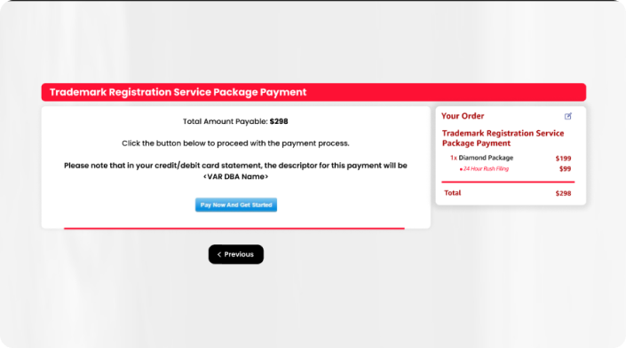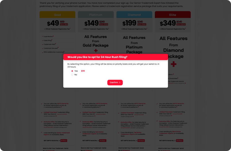 - At this stage, it is essential to inform the customer that the Official USPTO registration fee will be paid in addition to the trademark registration service fee, otherwise your conversion for this customer will NOT be counted.
